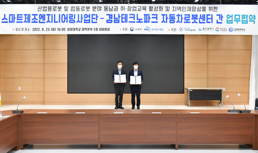 창원대학교 울산경남지역혁신플랫폼 스마트제조엔지니어링사업단은 지난 23일 경남테크노파크 자동차로봇센터와 '산업용로봇 및 협동로봇 분야 동남권 취·창업교육 활성화 및 지역인재양성을 위한 상호교류 및 업무협력 협약'을 체결했다고 24일 밝혔다.