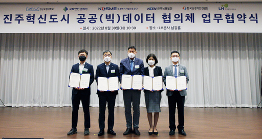 경상국립대학교 대학원 기술경영학과(MOT)와 진주혁신도시 5개 공공기관(국토안전관리원, 중소벤처기업진흥공단, 한국남동발전, 한국승강기안전공단, 한국토지주택공사)은 지난달 30일 오전 LH본사 남강홀에서 '공공(빅)데이터 이용 활성화 협의체' 업무협약을 체결했다.