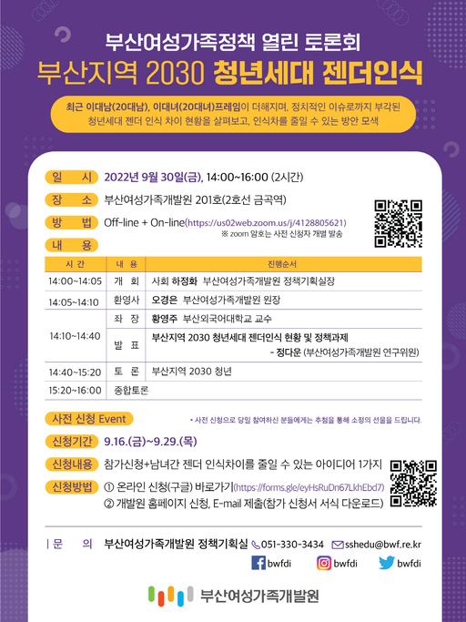 부산여성가족개발원은 '부산지역 2030 청년세대 젠더인식 현황 및 정책과제'라는 주제로 오는 30일 오후 2시부터 개발원 201호에서 온·온프라인 동시 진행방식으로 토론회를 진행한다.