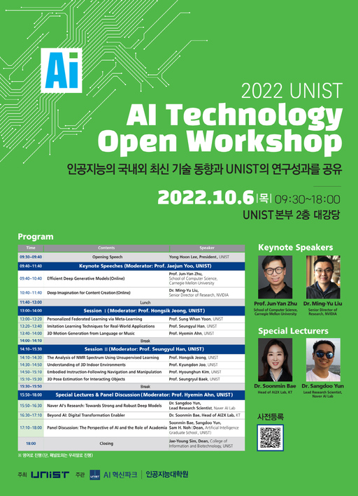 10월 6일 UNIST 대학본부 대강당에서 '2022 UNIST 인공지능기술 공개 워크숍(2022 UNIST AI Technology Open Workshop)' 행사가 올해도 개최된다.