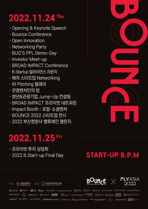 한편 BOUNCE 2022는 아시아 창업 엑스포 '플라이 아시아(FLY ASIA) 2022(이하 플라이 아시아)'와 공동 개최하며, 플라이 아시아 홈페이지에서 사전 접수를 일괄적으로 받을 예정이다.