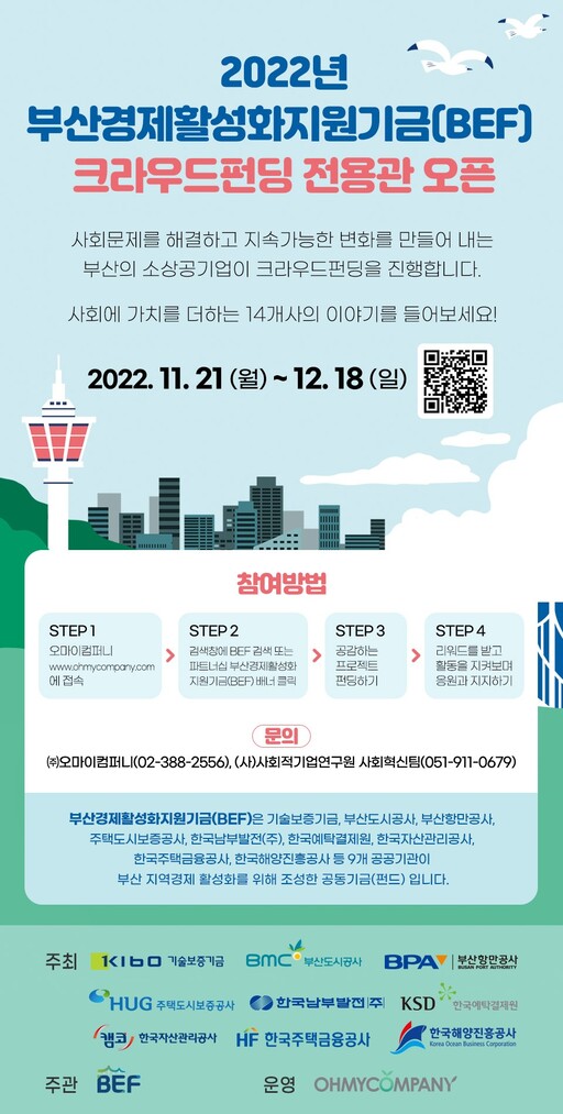 부산항만공사 등 부산지역 9개 공공기관은 '부산경제활성화 지원 기금(BEF)'을 활용해 부산지역 소상공인 지원을 위한 크라우드펀딩 사업을 진행한다고 23일 밝혔다.
