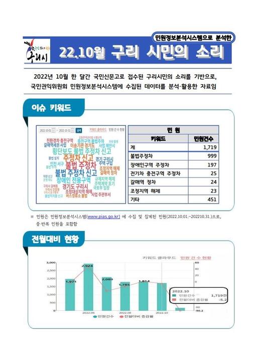 구리 시민의 소리는 직전 한 달간 국민신문고로 접수된 구리시 민원 정보 데이터를 분석·활용해 전반적인 민원 동향부터 구체적인 민원 사례까지 파악할 수 있도록 만든 자료로 전 부서에서 공유하고 민원 제도 개선 발굴을 위한 기초 자료로 활용된다.