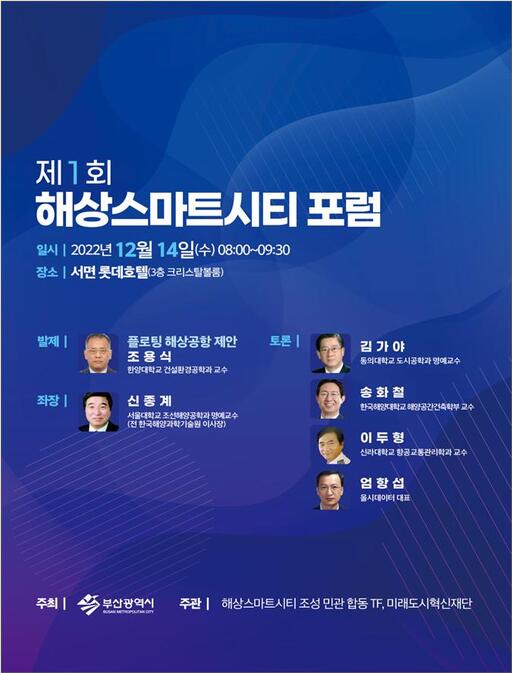 부산시는 오는 14일 오전 8시 서면 롯데호텔 3층 크리스탈볼룸에서 '제1회 해상스마트시티 포럼'을 개최한다.