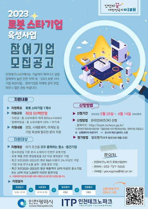 인천테크노파크(인천TP)는 인천시와 함께 오는 14일까지 '인천 로봇 스타기업 육성사업'에 참여할 중소·중견기업을 모집한다고 밝혔다.