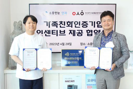 부산광역시일생활균형지원센터는 센텀소중한눈안과와 지난 4월 28일 '가족친화인증기업을 위한 인센티브제공 업무협약'을 체결했다.