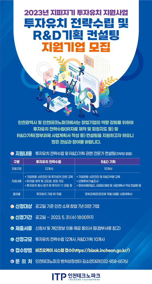 창업 7년 미만의 인천지역 기업의 성장을 돕는 사업으로 ▲투자유치 전략 수립 ▲연구·개발(R&D)기획 컨설팅을 지원한다.