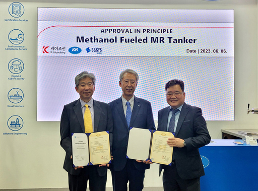 한국선급(KR)은 지난 6일 노르웨이 오슬로에서 열리고 있는 노르쉬핑(Nor-Shipping 2023)에서 케이조선(K Shipbuilding), 에스엔시스(S&SYS) 관계자가 참석한 가운데 '메탄올 이중연료추진 MR 탱커'에 개념 승인(AIP, Approval In Principle)을 수여했다고 밝혔다.