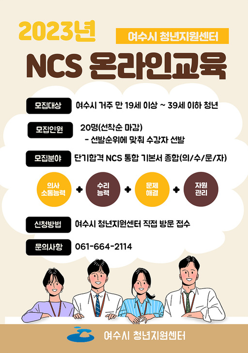 여수시(시장 정기명)는 공공기관 취업을 준비하는 청년들을 대상으로 NCS(국가직무능력표준) 온라인교육 참가자를 오는 16일까지 선착순 모집한다.
