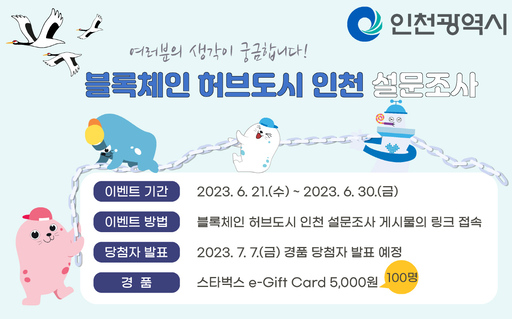 시는 6월 21일부터 6월 30일까지 인천시 사회관계망서비스(SNS)를 통해 '블록체인 허브도시 인천' 조성을 위한 마스터플랜(4개년) 수립에 활용하기 위해 시민 대상 설문조사를 실시한다고 밝혔다.