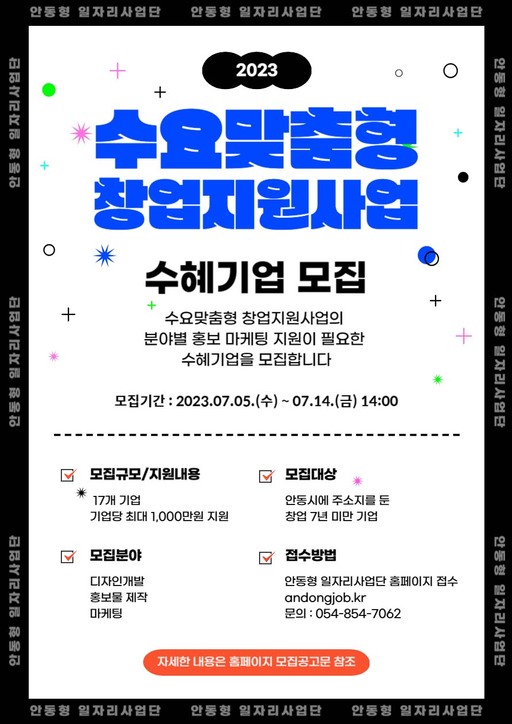 안동시와 안동대학교 안동형 일자리사업단은 창업기업의 홍보·마케팅을 지원하는 '수요맞춤형 창업지원사업'에 참여할 기업을 14일까지 모집한다.