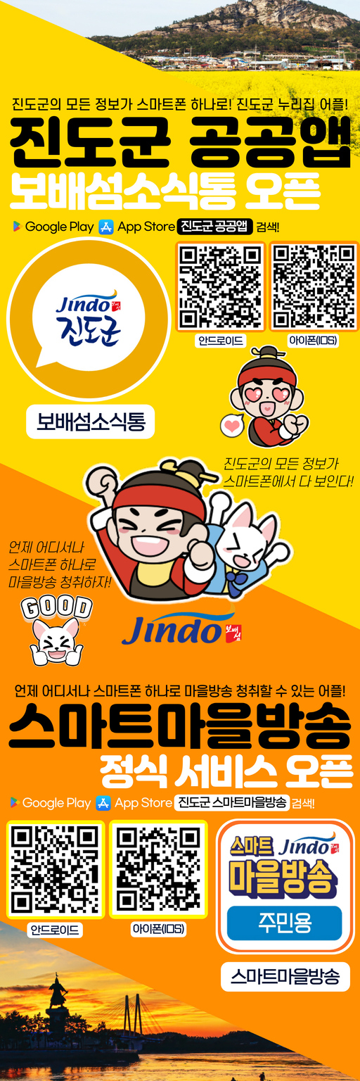 구글플레이어와 애플스토어에서 '진도군 공공앱(보배섬 소식통)'과 '스마트마을방송'을 검색해 앱을 다운로드하면 누구나 이용이 가능하다.