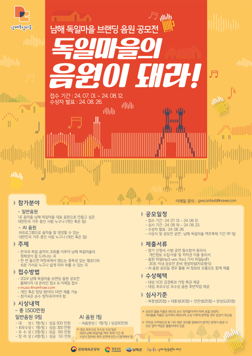남해관광문화재단이 대한민국 거주자 누구나 참가할 '남해 독일마을 브랜딩 음원 공모전'을 개최한다.