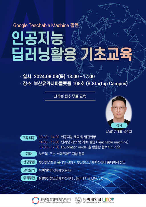 부산창조경제혁신센터는 동아대학교 LINC3.0 사업단과 함께 인공지능 딥러닝 활용 기초교육을 오는 8일 오후 1시에 부산유라시아플랫폼에서 진행한다고 밝혔다.