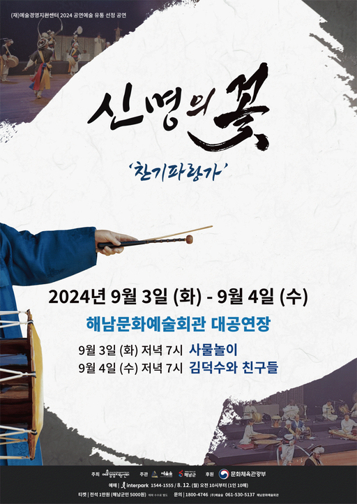 해남군은 사물놀이 명인 김덕수와 함께하는 <신명의 꽃-찬기파랑가> 공연을 9월 3일과 4일 이틀간 해남문화예술회관 대공연장에서 개최한다.