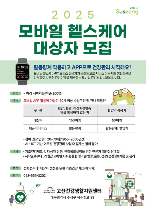 대구 수성구보건소 고산건강생활지원센터가 2025년 '모바일 헬스케어' 대상자를 모집한다고 9일 밝혔다.