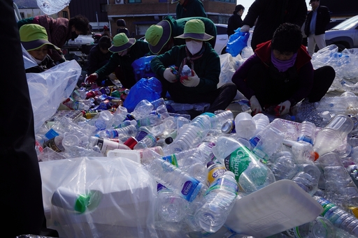 매주 화요일 해남군 화산면사무소 앞 땅끝희망이 자원순환가게 앞마당은 면내 43개 마을에서 출동한 주민들로 북새통을 이룬다. 마을에서 수집한 페트병과 캔, 플라스틱 등이 가득찬 자루가 연달아 내려지고, 너나할 것 없이 손을 보태 다시 한번 정밀하게 분류작업을 갖는다.