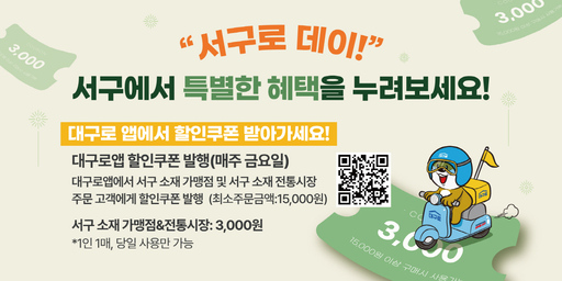 '서구로데이'는 3월부터 12월까지 운영되며, '대구로' 앱에서 매주 금요일 3,000원 할인 쿠폰을 발급받아 서구 내 가맹점에서 사용할 수 있다.