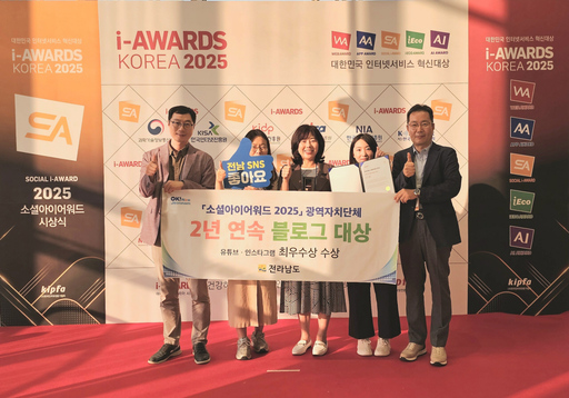 전라남도가 국내 대표적인 SNS 시상식인 '소셜아이어워드(Social i-Awards) 2025'에서 공식 블로그가 광역자치단체 부문 2년 연속 대상을, 유튜브·인스타그램은 최우수상을 받았다.