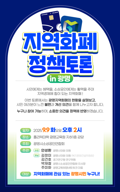 광명지역화폐의 현황과 개선 방향을 논의하는 정책토론회가 오는 9월 9일 오후 2시 폴리텍대학 광명교육원 지하1층 강당에서 열린다. '지역화폐 정책토론 in 광명'으로 명명된 이번 토론회는 광명시소상공인연합회가 주최하며, 광명시의회 안성환 의원이 좌장을 맡아 진행한다.