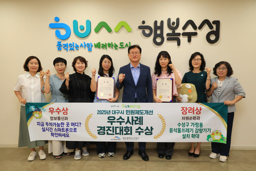 대구 수성구는 대구시가 주관한 '2025년 민원제도개선 우수사례 경진대회'에서 '스마트 주차정보 시스템'이 우수상, '가정용 음식물처리기 구매 지원사업'이 장려상을 받았다고 14일 밝혔다.