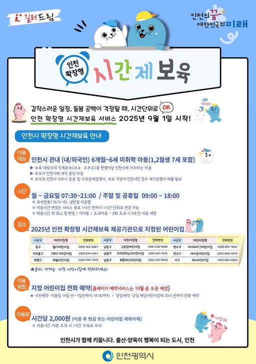 이번 시범사업은 기존 교육부 시간제 보육보다 운영 범위를 넓혀 인천형 모델로 설계됐다. 생후 6개월부터 만 6세까지 아동을 대상으로 하며 평일 오전 7시 30분부터 오후 9시까지, 주말과 공휴일에는 오전 9시부터 오후 6시까지 이용할 수 있다. 이용 요금은 시간당 2천 원으로 책정됐고 월별 횟수에 제한이 없다.