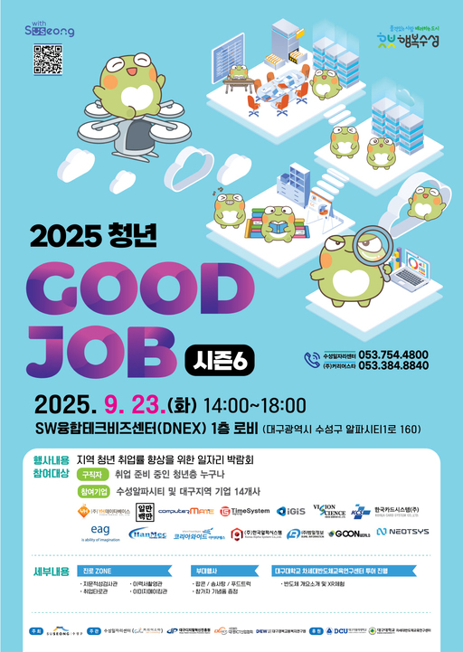대구 수성구는 오는 23일 수성알파시티 SW융합테크비즈센터에서 지역 청년 구직자의 고용 촉진과 수성알파시티 활성화를 위한 '2025 청년 굿잡(GOOD JOB) 일자리 박람회 시즌6'를 개최한다고 밝혔다.