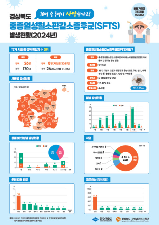 2024년 기준 경상북도는 SFTS 확진자 수가 전국 3위에 해당하는 26명을 기록했고, 이 중 8명이 사망해 치명률은 30.8%에 달했다. 이처럼 높은 사망률에도 불구하고 예방백신이 없어, 감염을 막기 위한 사전 조치가 무엇보다 중요하다는 지적이다.