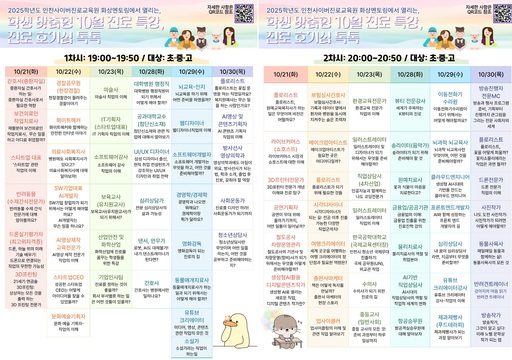 이번 특강은 매주 화요일부터 목요일까지 열리며 오후 7시와 8시 두 차례 강의로 나뉜다. 인천시교육청 소속 진로·직업 멘토단 2,000명이 강사로 참여해 초·중·고 학생들에게 실제 현장에서의 경험과 직업 정보를 전달한다.