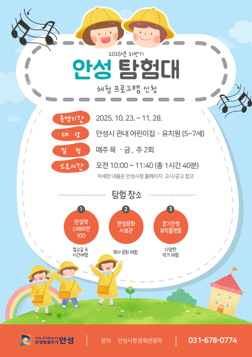 안성시는 상반기 시범 운영으로 큰 호응을 얻은 유아 대상 체험형 프로그램 '안성 탐험대: 역사 속으로, 음악 속으로!'를 하반기에도 운영하며 지역 문화시설 활성화에 나선다.