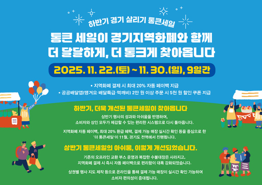 이번 하반기에는 페이백 최대 20%에 경기지역화폐 인센티브(최대 10%)가 추가 적용돼 총 30% 혜택을 받을 수 있으며, 공공배달앱 ▲배달특급 ▲땡겨요 ▲먹깨비를 통한 2만 원 이상 주문 시 5천 원 할인 쿠폰 행사도 함께 진행된다.