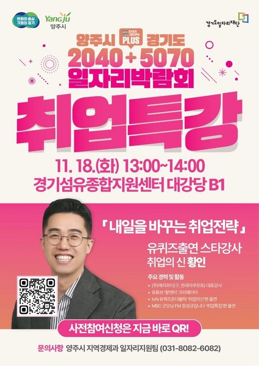 양주시가 오는 18일 경기섬유종합지원센터에서 열리는 「2025 양주시&경기도 2040+5070 통합 일자리박람회」에서 취업 전문가 황인 강사의 특별 강연을 진행한다.