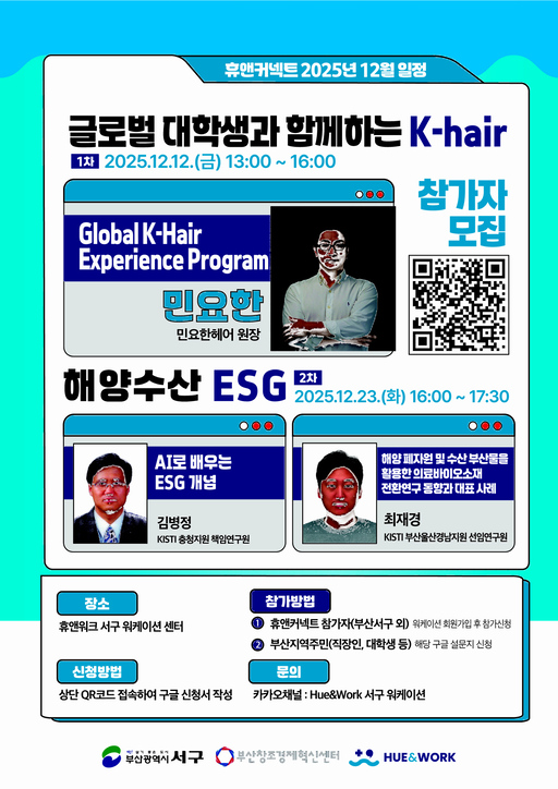 두 번째 프로그램은 한국해양수산ESG연구조합과 한국과학기술정보연구원이 함께하는 '지속 가능한 미래를 위한 해양 수산 ESG' 특강으로 꾸려진다. AI로 배우는 ESG 개념, 해양 폐자원·수산 부산물을 활용한 의료 바이오 소재 연구 등 해양 수산 ESG 산업 분야의 최신 동향을 다룬다.