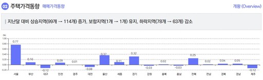 주택 유형별로 보면 아파트는 비교적 안정적인 상승 흐름을 보였지만, 연립주택과 단독주택은 지역별로 보합 또는 제한적인 상승에 그쳤다.