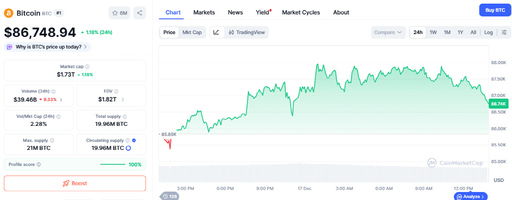 가상자산 시황정보사이트 코인마켓캡에 따르면 '가상자산 대장주' 비트코인은 17일 오후 2시께 1BTC당 8만6748.94달러에 거래됐다. 24시간 전보다 1.18% 상승한 가격으로, 비트코인이 4000달러 넘게 하락한 전일 하락분을 일부 되돌렸다. 지난 10월 7일 사상 최고가(12만6198달러)와 비교해선 약 31.22% 하락했다.