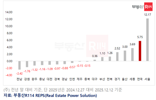 17일 부동산R114에 따르면 2025년 전국 아파트 매매가격은 지난 12일 기준 5.75% 상승했다. 지난 2019년 4.17%를 웃돈다. 특히 서울은 올해 12.17%나 올랐다.