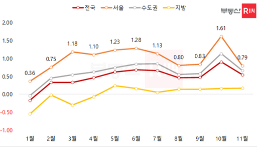 반면 경기·인천은 2.05% 상승에 그쳤고, 5대광역시 상승률도 0.50%로 작년과 비슷한 수준을 유지했다. 기타지방은 -0.12%로 집값이 오히려 빠졌다.