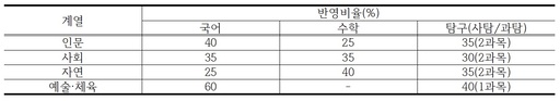 이에 따라 인문, 사회, 자연, 예술·체육 계열의 모집 단위를 수능 과목별 반영 비율이 변경됐다. 인문, 사회, 자연, 예술·체육 계열별 수능 영역 반영 비율이 달라 표준점수의 단순 총점이 같더라도, 반영 비율이 높은 영역의 성적에 따라 수능 환산 점수에 차이가 있다.