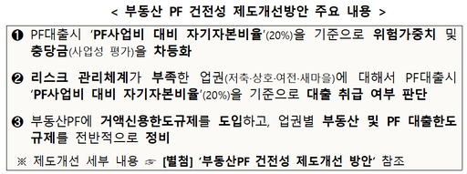 이날 관계부처들은 "부실 PF 규모 감소세가 유지될 수 있도록 경영진 면담, 부실감축계획 이행점검 등을 통해 부실 PF 사업장에 대해 상시적으로 정리·재구조화를 추진해 금융회사의 건전성 관리를 강화해 나가겠다"라고 말했다.