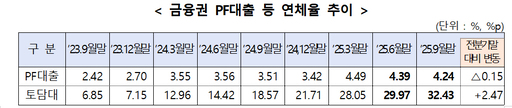 9월 말 기준 전체 금융권의 부동산 PF 관련 대출 잔액은 116조4000억원을 기록했으며, 연체율은 4.24%로 직전분기 대비 0.15%포인트(p) 하락했다. 다만 저축은행·여전사·상호금융 등 중소금융사와 토지담보대출 연체율은 32.43%로 높은 수준을 유지했다. 대출 잔액이 빠르게 감소한 가운데, 잔여 채권의 연체 규모가 늘어난 데 따른 것이다.