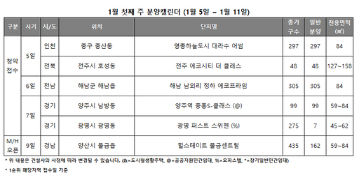 수도권에서는 인천 중구 '영종하늘도시 대라수 어썸'(297가구), 지방에서는 전북 전주시 '전주 에코시티 더 클래스'(48가구), 전남 해남군 '해남 남외리 정하 에코프라임'(305가구)의 청약이 이뤄진다. 경기 양주시 '양주역 중흥S-클래스' 공공지원 민간임대와 광명시 '광명 퍼스트 스위첸' 오피스텔도 청약에 나선다.