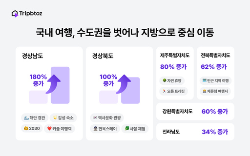 5일 트립비토즈에 따르면 여행 수요의 중심이 수도권에서 지방으로 이동하고 있다. 접근성과 인지도 위주의 단기 여행에서 벗어나, 지역 고유의 매력과 체험 가치를 기준으로 여행지를 선택하는 흐름이 뚜렷해지고 있다는 설명이다.