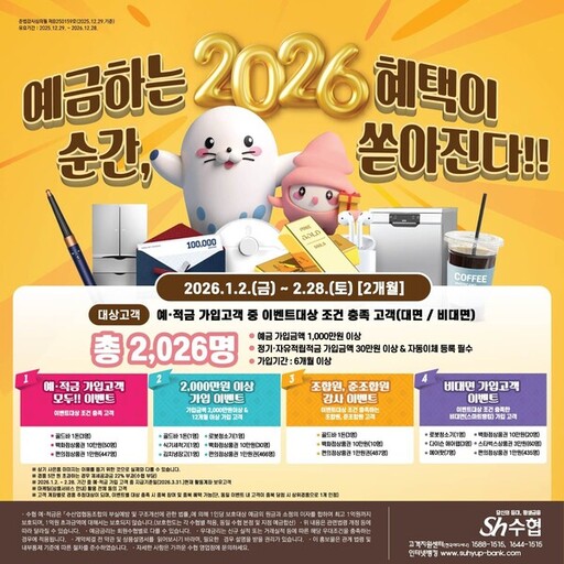 수협중앙회가 새해를 맞이해 오는 2월 28일까지 '2026 예금하는 순간, 혜택이 쏟아진다' 경품 이벤트를 진행한다. 이벤트는 예금 1000만원 이상 또는 정기·자유적립식 적금 30만원 이상 조건을 6개월간 충족한 신규 가입 고객을 대상으로 한다.