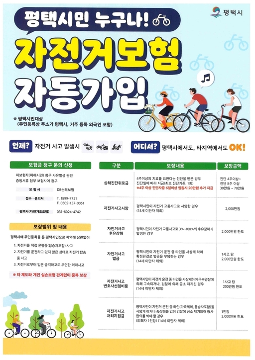 평택시 자전거 보험은 평택시에 주민등록이 된 시민이라면 별도의 가입 절차 없이 자동으로 가입되며, 자전거 사고로 인한 사망과 후유장해, 진단위로금, 벌금, 변호사 선임 비용 등을 보장한다.