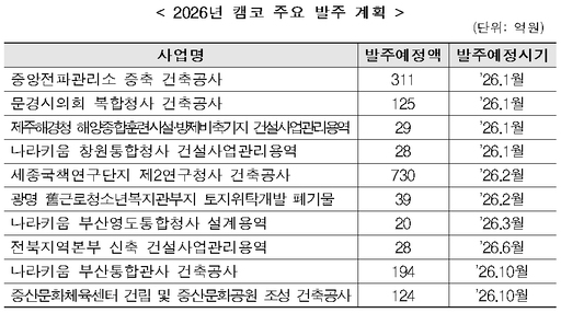 캠코는 올해 신규 발주 규모를 전년 대비 180% 수준으로 확대하는 한편, 전체 발주 규모의 약 76%를 상반기 내에 발주해 사업추진 속도를 높이고 침체된 건설경기 회복에 마중물 역할을 한다는 목표를 제시했다.
