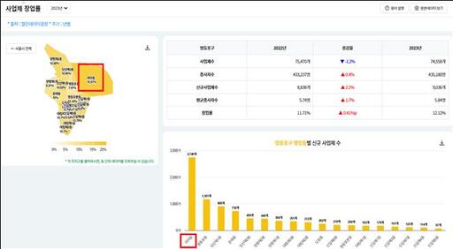 창업을 계획하기 전에 원하는 지역의 사업체 분포와 밀집 업종, 지역 거주자의 평균소득과 소비 규모, 지난 10여 년간 어떤 산업이 성장하거나 쇠퇴했는지 등을 '한 곳에서 한눈에' 시각 데이터로 확인할 수 있는 서비스가 제공된다.
