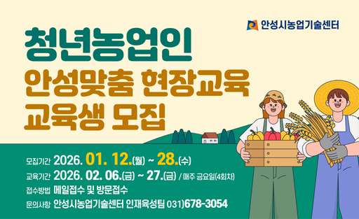 모집 기간은 1월 12일부터 28일까지이며, 모집 인원은 15명이다. 대상은 안성시 청년농업인과 창농을 희망하는 만 18세 이상 40세 미만 청년으로, 신청은 이메일 또는 농업기술센터 인재육성팀 방문을 통해 가능하다.