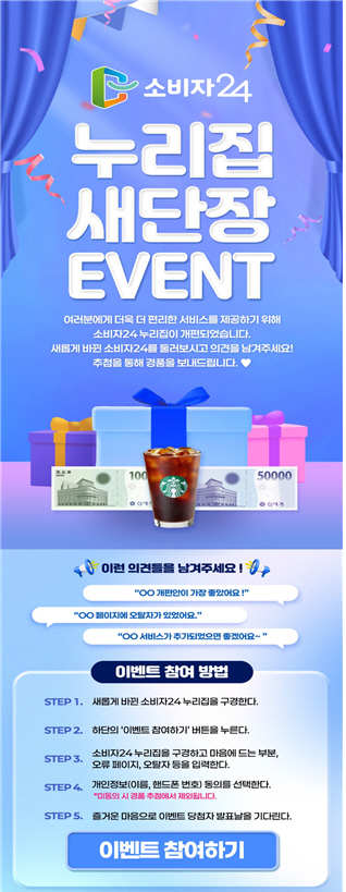 공정위는 누리집 개편에 따른 소비자 의견을 수렴하기 위해 이날부터 23일까지 소비자24 누리집에서 참여형 이벤트를 진행한다. 소비자는 소비자24 누리집 내 '알림소식-공지사항-이벤트' 게시판을 통해 개선 의견을 남기면 되며, 참가자 중 추첨을 통해 상품권 등 경품이 제공된다. 당첨자는 1월 30일 발표될 예정이며, 자세한 내용은 소비자24 누리집과 공식 블로그, 인스타그램 등 SNS 채널을 통해 확인할 수 있다.