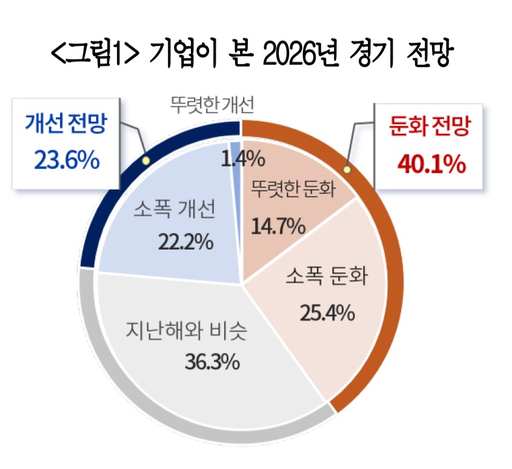 대한상공회의소는 13일 전국 2208개 제조기업을 대상으로 한 '기업이 바라본 2026 경제·경영 전망' 조사에서 응답 기업의 40.1%가 올해 한국 경제의 전반적인 경기 흐름이 지난해보다 둔화될 것으로 전망했다고 밝혔다. '지난해와 비슷한 수준'을 예상한 기업도 36.3%에 달해 전반적으로 올해 경기 흐름을 보수적으로 내다봤다. 반면 '전년 대비 개선될 것'이라는 응답은 23.6%에 그쳤다.