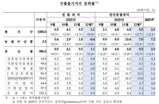 14일 한국은행이 발표한 '2025년 12월 수출입물가지수 및 무역지수(잠정)'에 따르면 12월 수출물가(원화기준)는 전월 대비 1.1% 상승했고 전년 동월 대비로는 5.5% 올랐다. 수출물가 상승은 원·달러 평균환율이 11월 1457.77원에서 12월 1467.40원으로 상승한 가운데, 컴퓨터·전자및광학기기와 1차금속제품 등이 오른 영향으로 설명됐다.